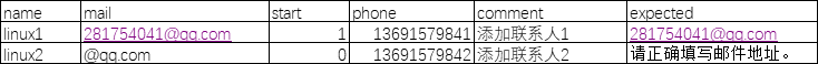 新建excel文件,分3个sheet,分别为:login,contact,mail #每个sheet中数据可自行填写,驱动测试用例执行不同的数据进行测试