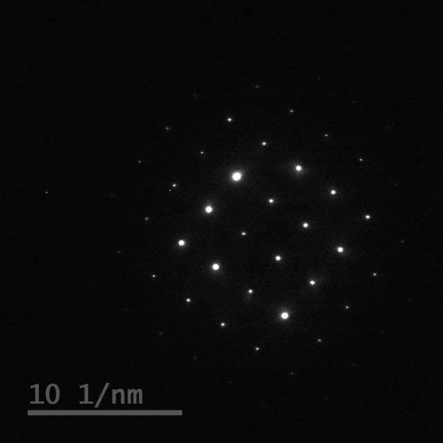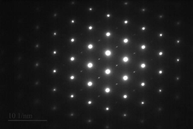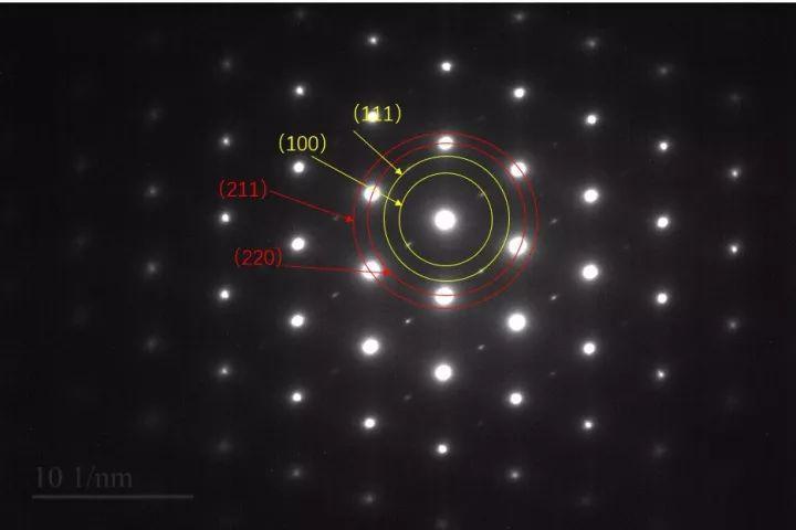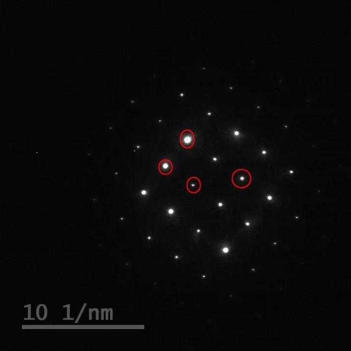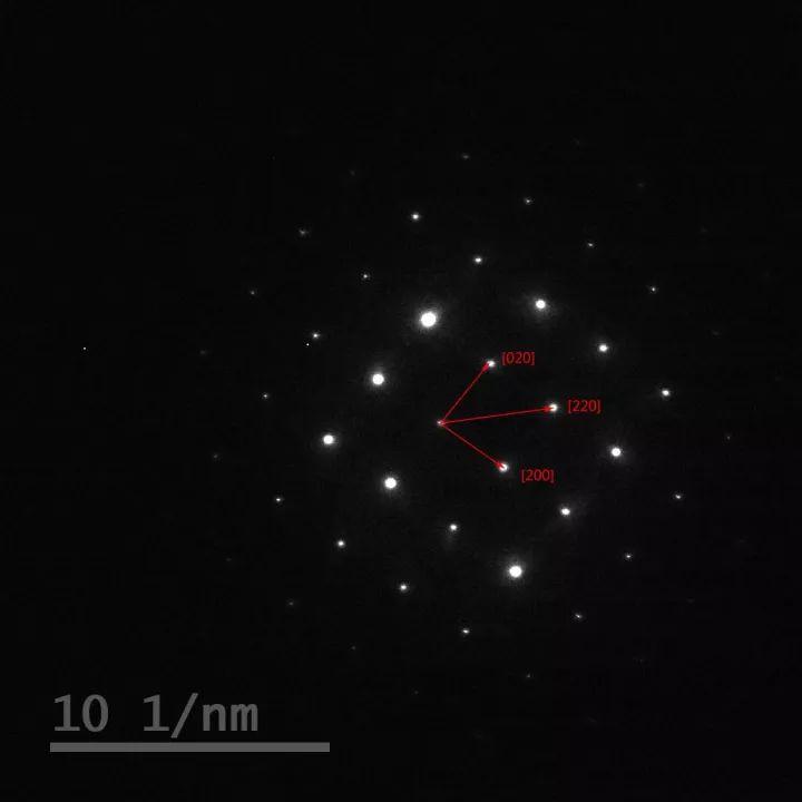 单晶材料SAED照片最后处理结果如图所示。需要注意的是,单晶材料中衍射点所对应的衍射晶面满足矢量叠加原则。