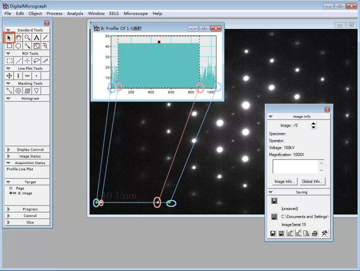 然后在 profile of 对话框中点击左键不要松,拖动可选择沿图像中已知线条(图中蓝色线条包围区域)任意长度距离的线条(图中红色箭头包围区域)。在线条的中间显示出所选区域所占长度单位。再测量出标尺长度。图中为810单位长度,即在图像中810单位长度代表实际的10 nm-1 。也就是说81单位长度代表1 nm-1 。