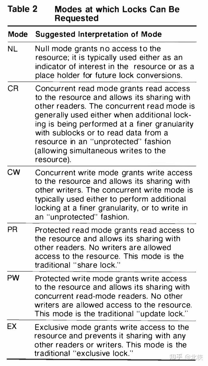 dlm抽象出了6种锁模式,严格度高的锁可以向严格度低的锁模式转换。下面是6种模式以及每种模式使用场景。