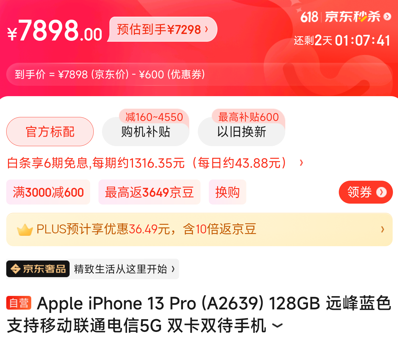 iPhone13Pro原价7999元,今天京东将价格调整到7898元,也就是优惠101元,然后还可以领一张600元的优惠券,到手价7298元。