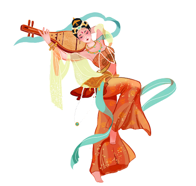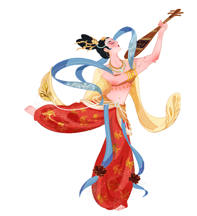 琵琶伎乐,捧花飞天,霓裳羽衣。