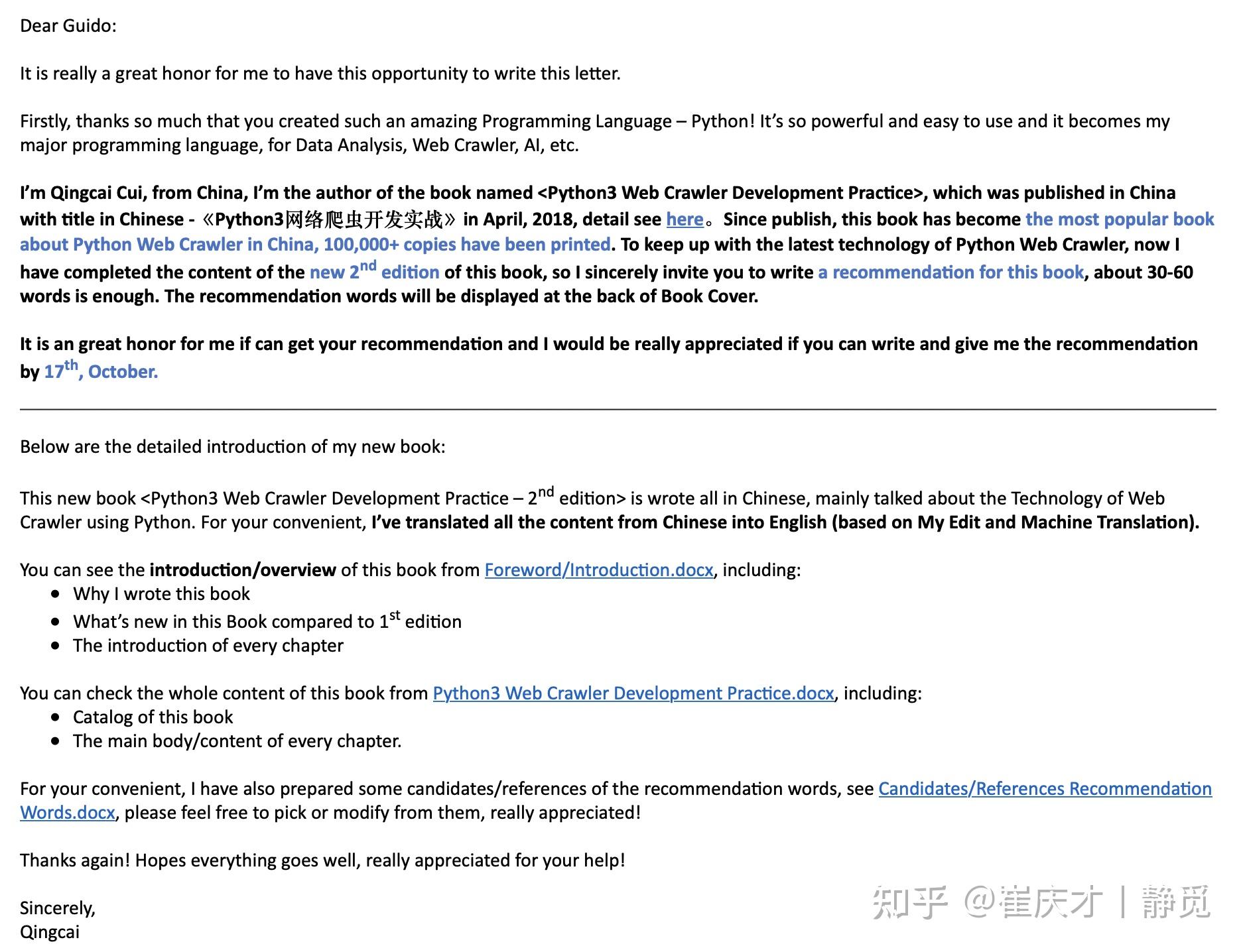 为了更正式一点,我发了一封邮件给 Guido,邮件整体的内容就是:先表示下对他的感谢和敬佩,然后介绍下自己的基本情况和书的基本情况,比如我是做什么的,第一版书在中国的销量等等,接着开门见山地说想要请他帮忙写一段推荐语。然后后面就附上我的书的一些详细信息,比如我整理的全文翻译书稿、内容介绍、候选推荐语等。