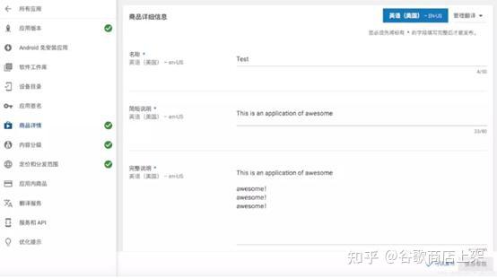 默认语言和名称填写完毕后,点击“创建”,会跳转到商品详情页,填写App的简介和详细说明