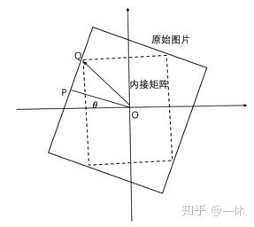 通过上述的操作旋转的图像会有存在黑边,如果想去除掉图片的黑边,需要将原始的图像做出一些牺牲,对旋转后的图像取最大内接矩阵,该矩阵的长宽比和原始图像相同,如图2-35所示。要计算内切矩阵的坐标Q,需要通过旋转角度 和原始图像矩阵的边长OP得到。