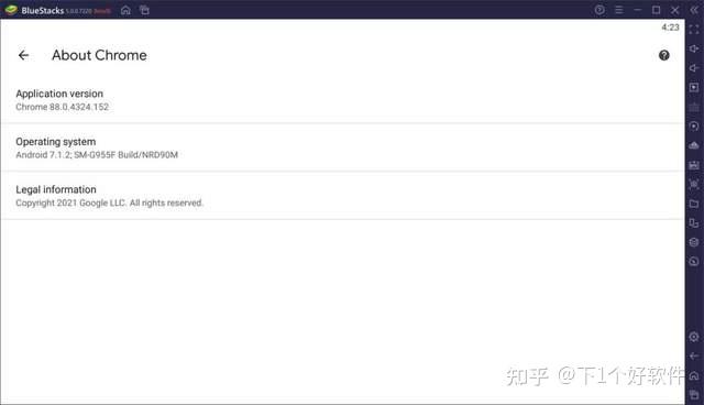 在「BlueStacks 5」系统的设置里面并没有显示安卓版本是多少,不过雷锋哥在 浏览器 Chrome 的关于里面有显示 Android 7.1.2 版本。要知道目前市面上部分安卓模拟器还是 5.0 的安卓版本。