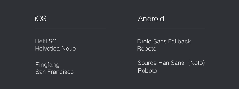 通常客户端的字体不需要选择,跟着手机系统默认设置走就好了。iOS 9 之后默认中文字体 Pingfang,有 6 种字重,英文和字符部分字体是 SF UI。苹方相比之前的华文黑体略显圆润,刚开始大家还都不太习惯,嚷嚷着安卓化了,现在看来这套字体表现不错,字重比较多,细体还比较优美。有一篇文章总结了 iOS 字体演进的历史可以看一下 《Mac OS / iOS 六年字型战争》 ,这篇文章里花大篇幅鄙视了华文黑体设计上的各种问题。Android 默认中文字体思源黑体 Source Han Sans ,虽然设计上有七种字重,但是好像在实际应用中只能选择两种字重?且这两种字重很难令人满意。需要说明的一点是,Source Han Sans 是 Adobe 的称呼,在 Google 的体系里是 Noto 的一部分。Android 默认英文部分 Roboto,表现个人觉得不错。