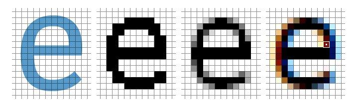 从左到右:理想形状、黑白渲染、灰度渲染、亚像素渲染。(图片来自网络)
