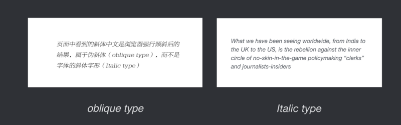 中文能不能用斜体?能。在 UI 界面设计中的一些辅助文案的地方用斜体可以起到一定的强调和装饰作用,但是在正文中大量用中文斜体是不恰当的做法,因为基本上中文字体本身都没有设计斜体字形,页面中看到的斜体中文是浏览器强行倾斜后的结果,属于伪斜体( oblique type ),而不是字体的斜体字形(Italic type)。中文因为笔画比较复杂,强行倾斜后会导致一些笔画变形,造成可读性降低、视觉也不够美观。