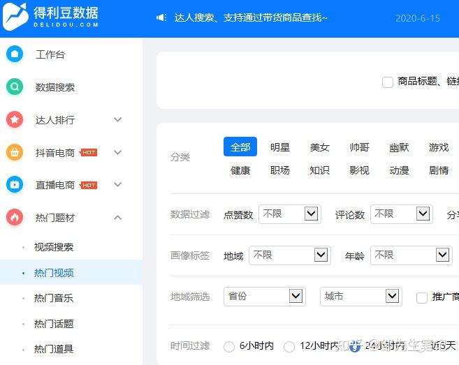 权威的第三方抖音数据分析平台,提供了详细的抖音账号、视频、商品趋势数据,以及实时的抖音热门音乐、热门视频、热门话题等数据。