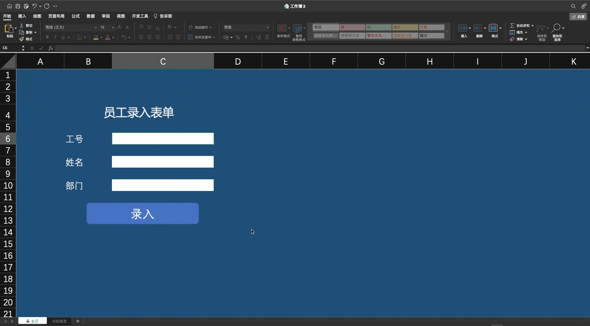 从演示效果中,我们可以发现,程序具备的功能为提供一个可输入的主页工作表,输入的信息会自动填充到详细信息的表格之中。这样的功能在日常生活中也会用到,接下来,让我们正式开场吧~