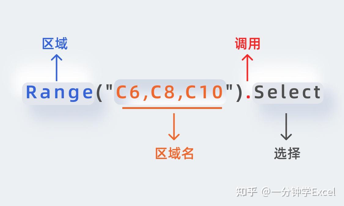 从上可知,【选中单元格区域】的VBA语法为Range跟上括号,括号中是区域名(多个区域需用逗号进行分割)然后跟上点号,点号的作用为调用,调用什么方法,后方的Select便是Select方法,作用为选中。简单来说,VBA的语法与我们平时习惯的中文语法相反,翻译过来便是C6—C10单元格区域调用Select方法。