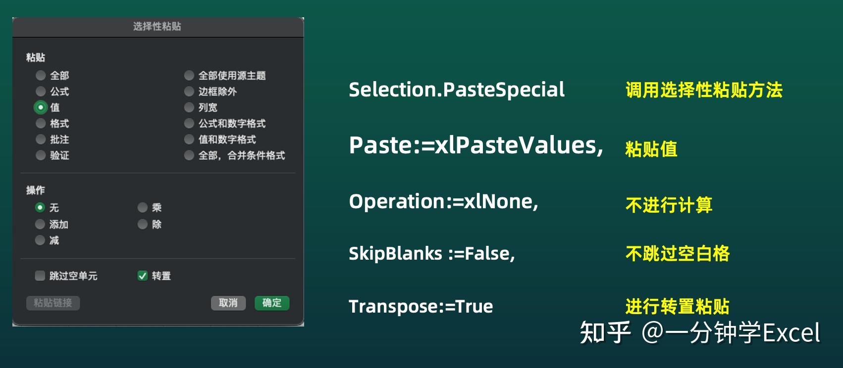 对照上图,我们需要执行的操作为:执行粘贴【值】,操作【无】,不需要跳过单元格,需要转置。则代码为:
