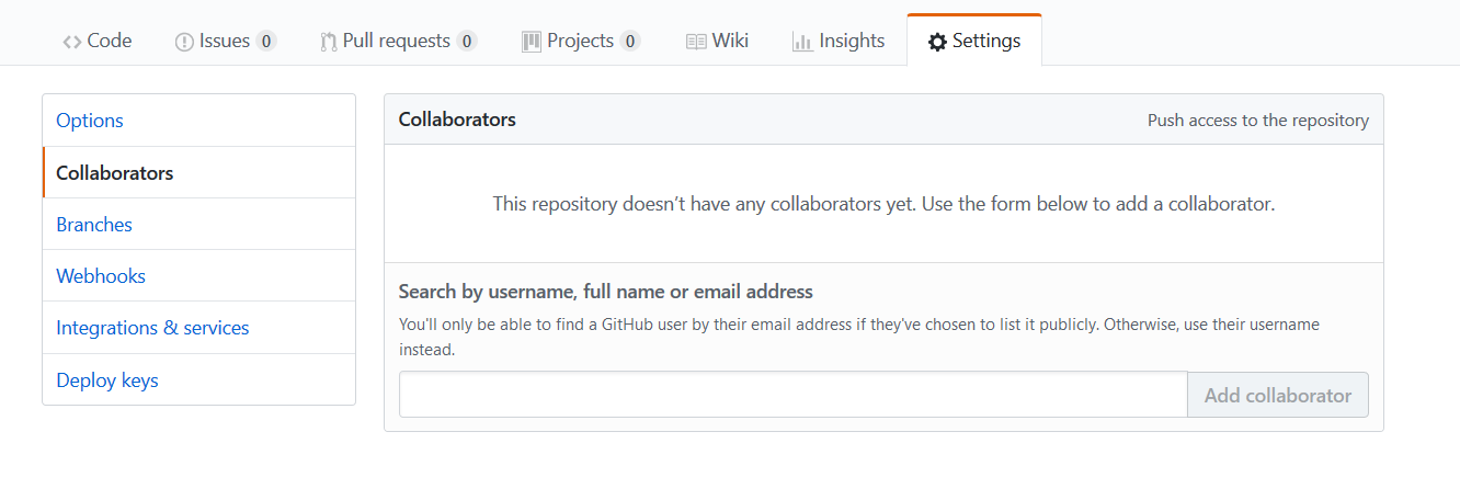 collaborators:在这里输入你想邀请的用户名,点击add collaborator即可发送邀请加入。