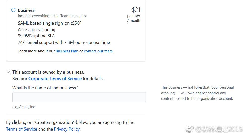 account is owned by a business”选项,这时你需要输入公司的名称,而该代码库也将由公司的账号控制。