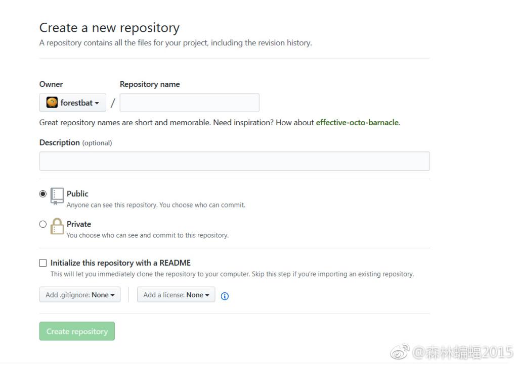 下面是选择这个代码库的公有(public)或者私有(private),默认为公有,任何人都可以查看;而私有的呢,就是你可以指定什么人可以看到并参与,相当于不开源和内部开源,当然别想着在GitHub上开私有库写日记,这玩意是付费的,而且有微博。