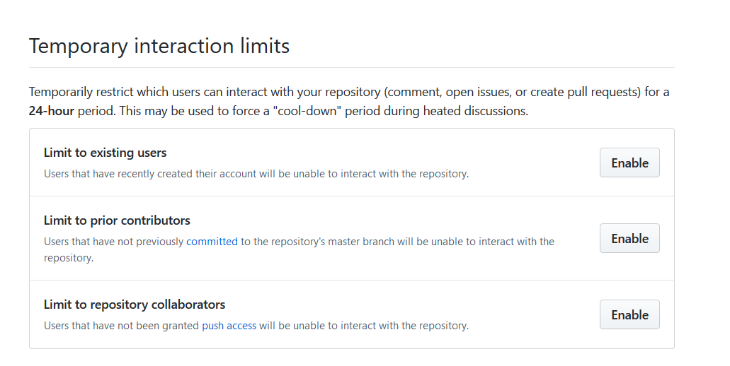Temporary interaction limits:这里允许你临时(24小时)禁止别人与你的代码库交互(例如回复,提问,创建PR),通俗来说就是“管理员全员禁言一天”,点击Enable按钮,把它变成disabled即可禁止。