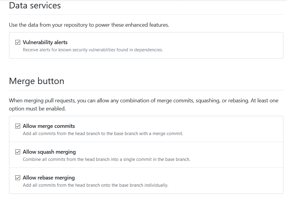 Vulnerability alerts:默认开启,如果你所依赖(dependencies)的代码库有安全漏洞,你将收到警告。