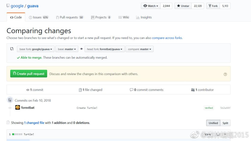 等上几秒,你就可以看到如上图界面,左上角为“你的ID/guava forked from google/guava”,意思就是“你从google这里抄的guava”,此时,原来的代码库被称作base fork(可理解为原本),而你抄来的被称作head fork(抄本),你可以任意修改你的抄本,画只乌龟进去都行。