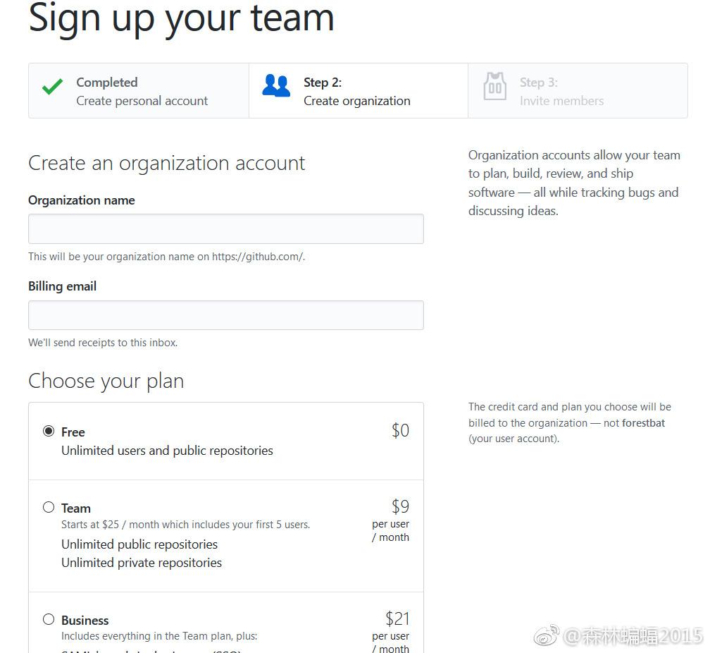 输入组名,Billing email(支付邮箱,你常用的邮箱即可)。如果你的开源项目属于公司(例如阿里的开源项目),可以视需求选择business选项,并选中“This