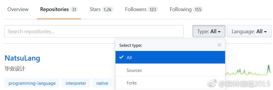 如果你有太多的代码库(一般来讲有这么多代码库的都是不需要看这教程的大牛,或者说看这教程的都没几个库),可以按照type(代码来源种类,例如forks),和language(例如Java)进行搜寻。