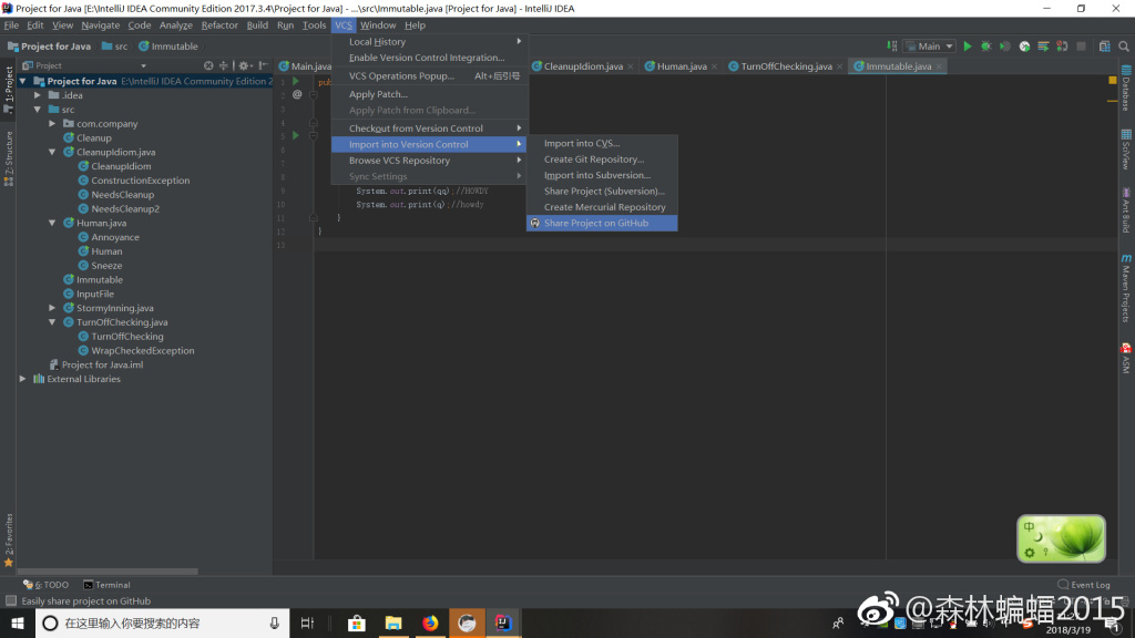 然后点击VCS(Version Control System,版本控制系统的缩写),点击“import into version control”-“share project to git hub”,IDEA便会弹出对话框让你对此库命名并在GitHub上新建一个空库。