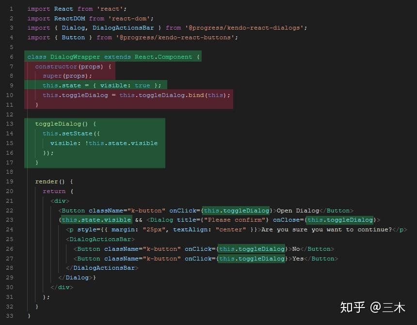 toggleDialog函数并将其切换到ES6箭头函数样式语法,第14行到第16行只需调用useState()赋值提供的更新方法setVisible,它将引用的值将是可见的,而不是this.state.visible。 -
