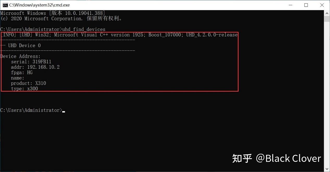 用X310连接电脑,通过WIN + R打开“运行”,输入cmd打开命令提示符,输入“uhd_find_devices”,得到下图所示的结果,证明安装成功。