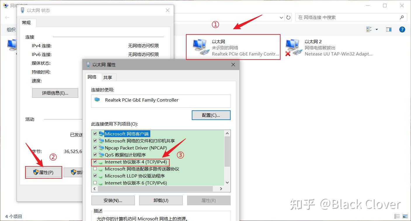 点击“更改适配器”选项,找到“以太网”,双击打开后点击其属性,点击“Internet协议版本4(TCP/IPv4)”