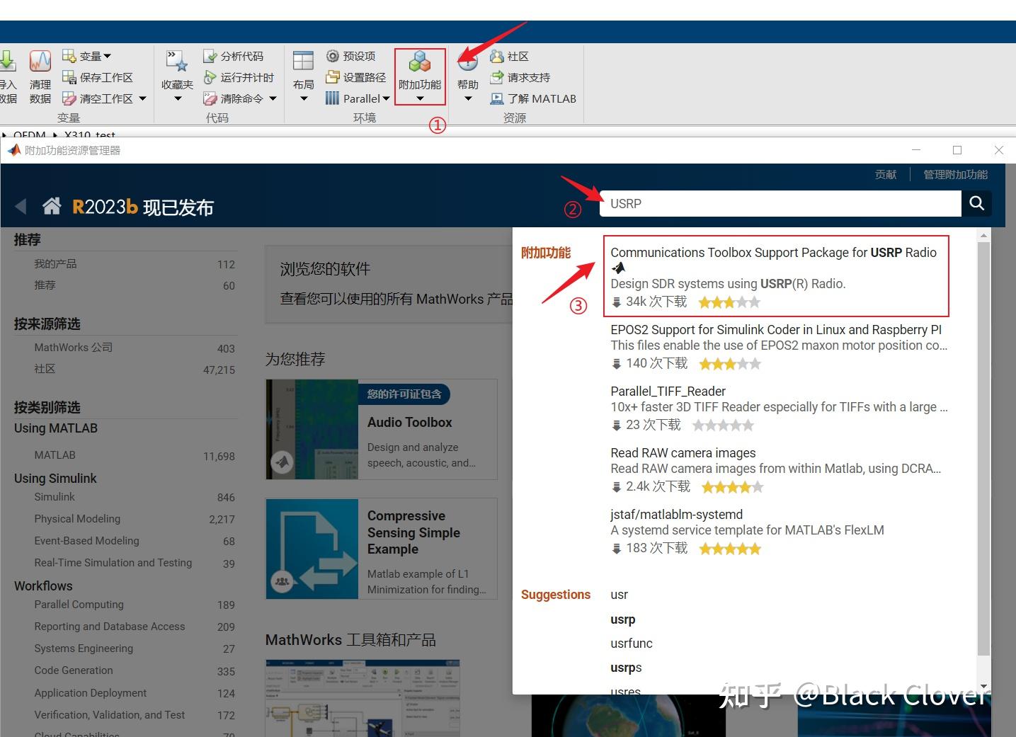 1.在MATLAB的附加功能中找到“Communication Toolbox Support Package for USRP Radio”,进行安装
