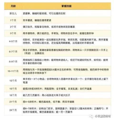 关于0-2岁孩子的 精细运动发展规律 ,可以参考这个表格: