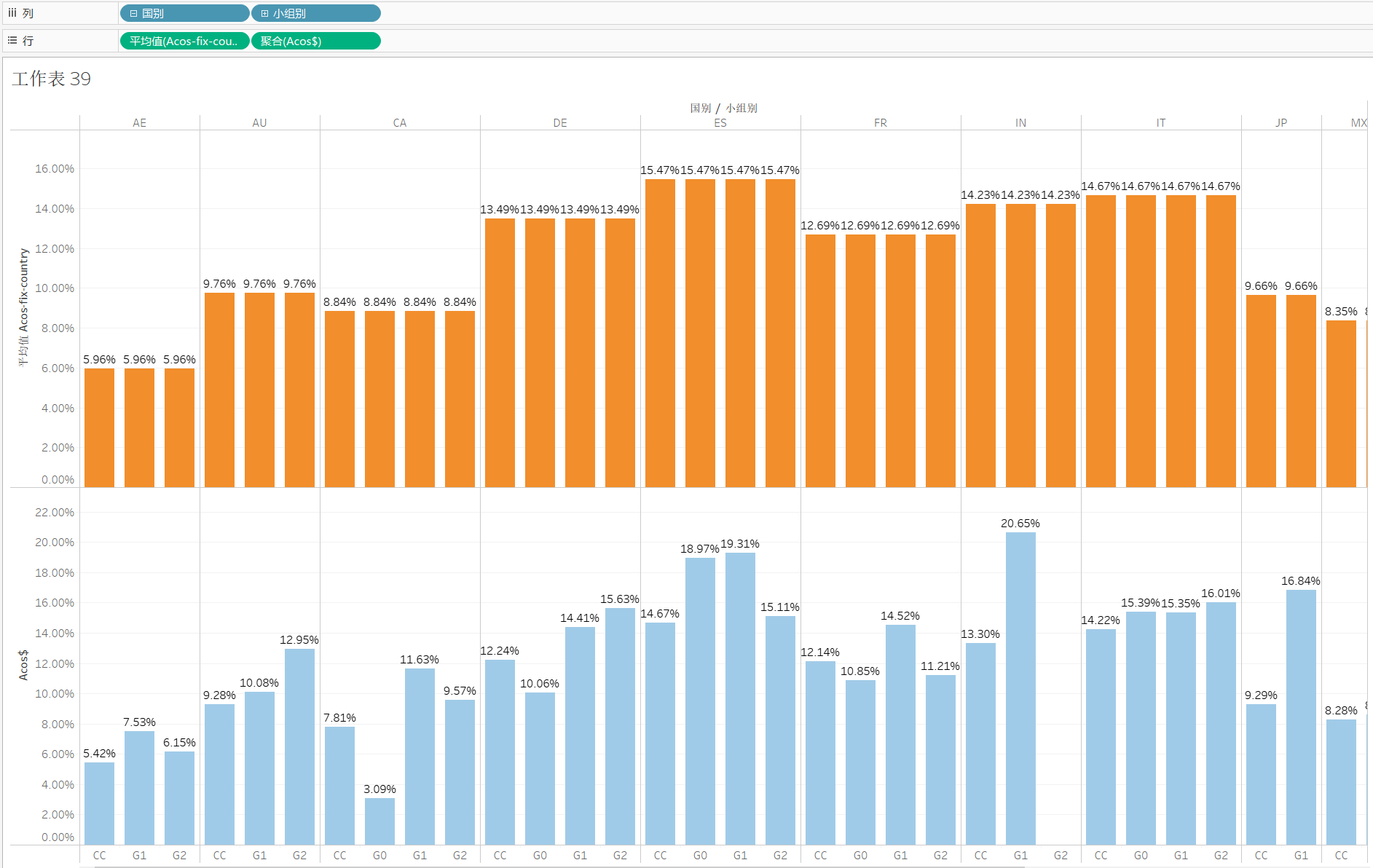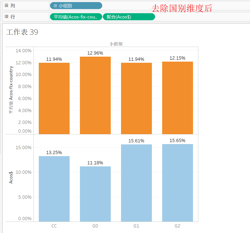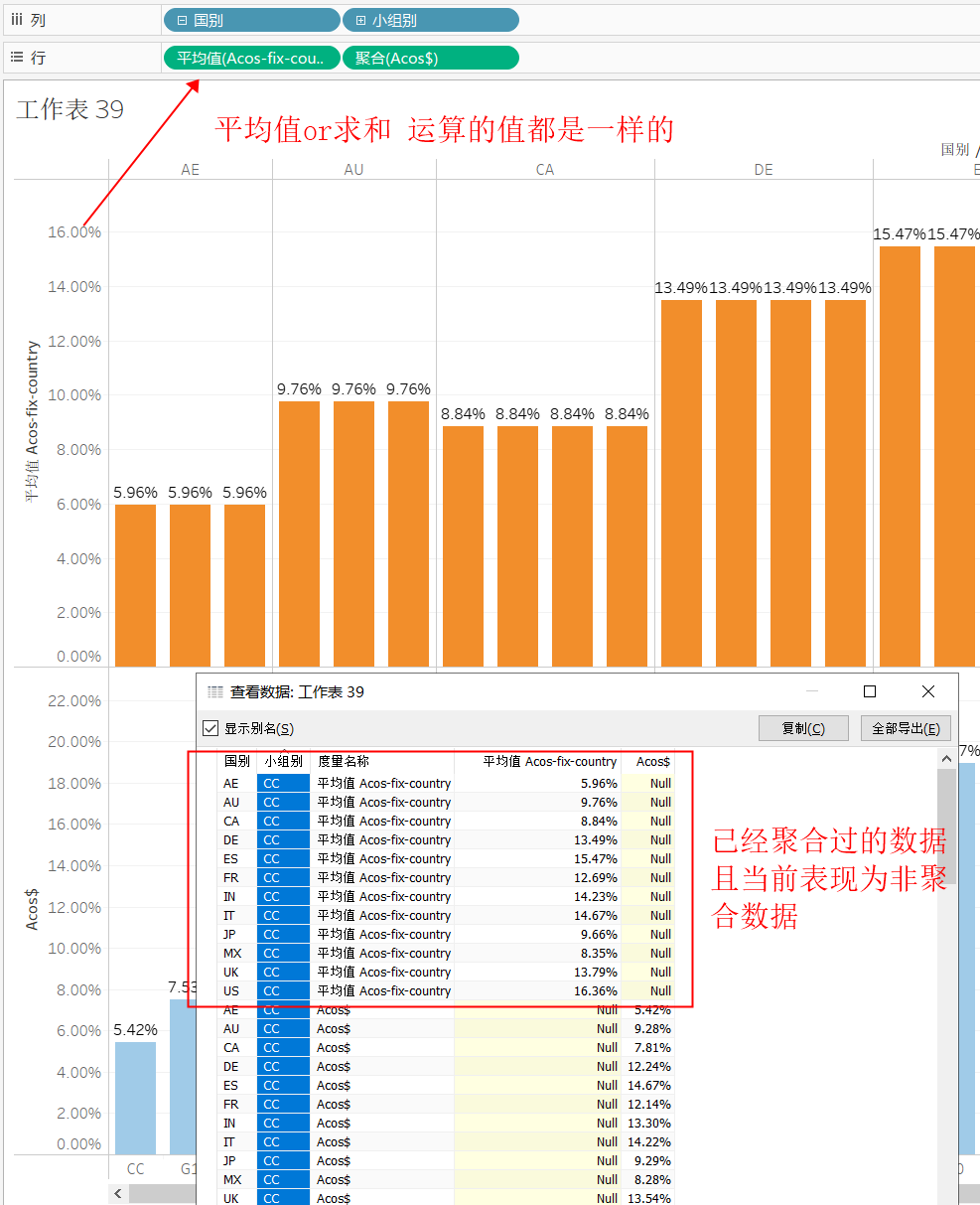 可以看到,针对国别字段的维度,不管小组别是多少,国别字段的值都是一样的,也就是说fixed只对国别进行了聚合,其他字段对其无效;下面难受的Acos$字段就是正常的聚合按照国别和小组别同时聚合算出来的结果;