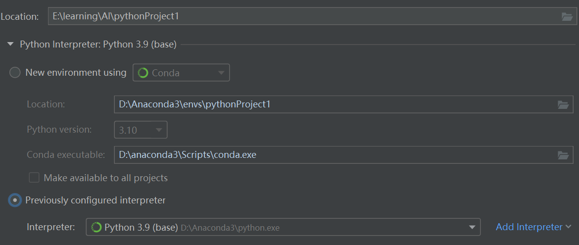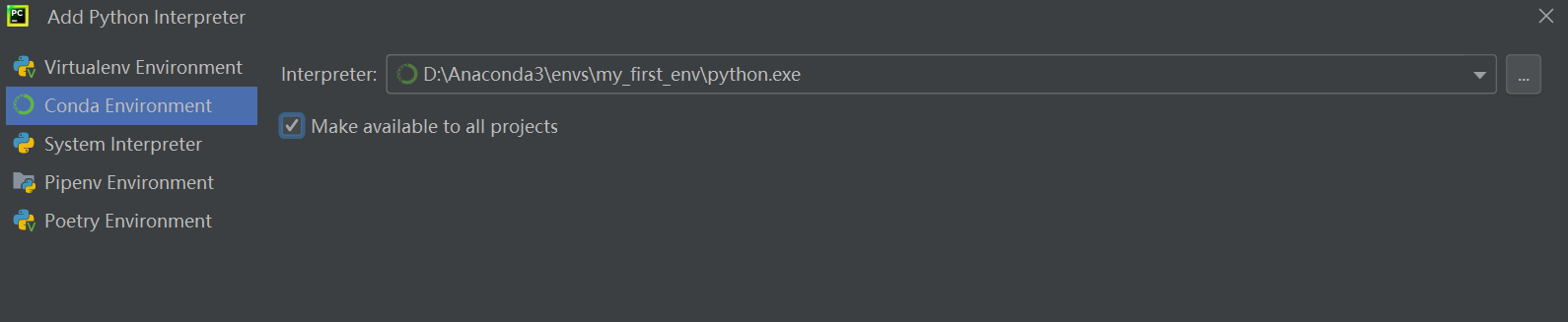 选择如下图刚创建的环境下的python.exe,勾选make available to all project