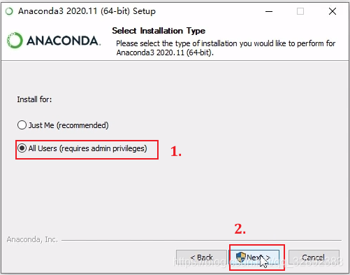 这里推荐选择JUST ME,否则anaconda没有权限配置环境,需要手动配置
