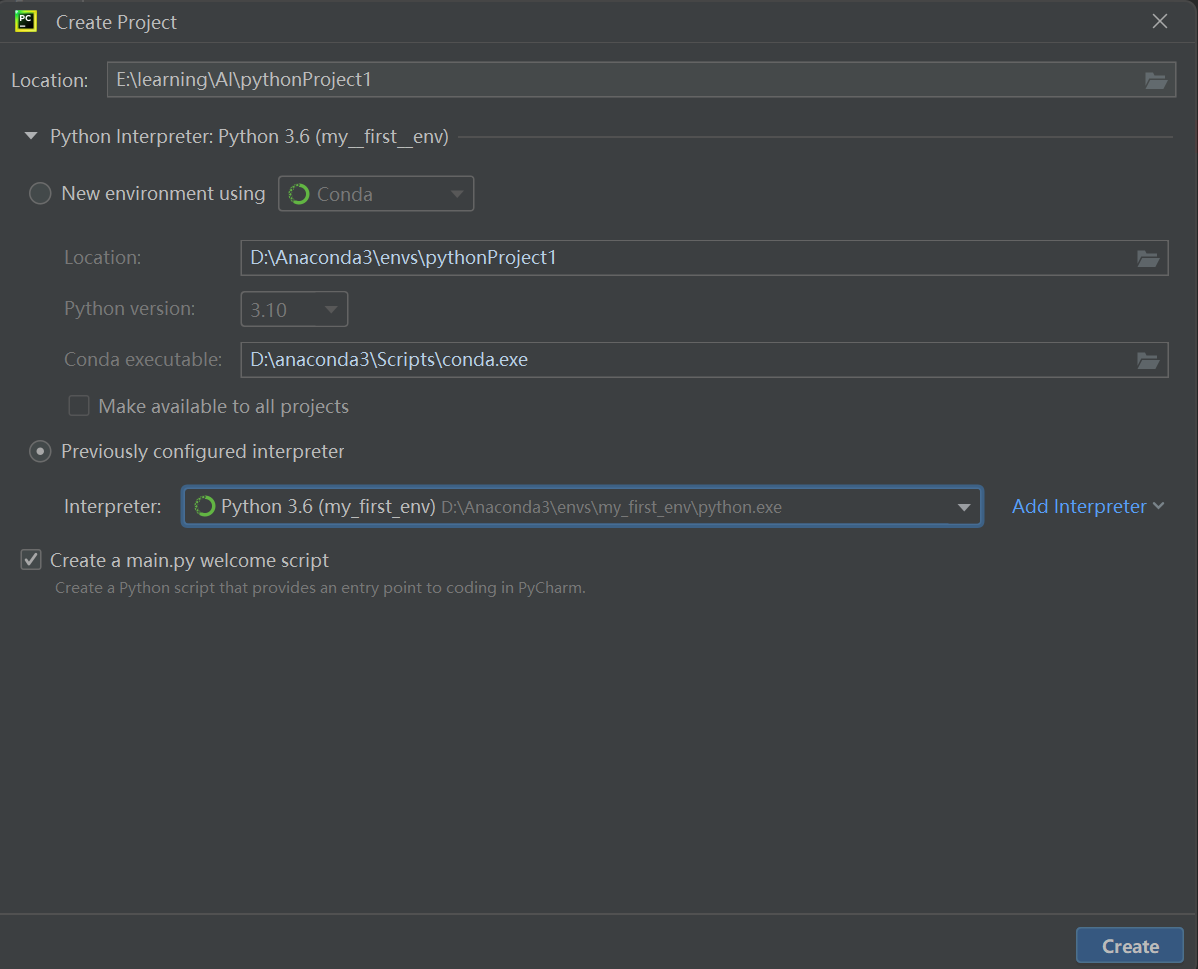<my_first_env>可以代替为你自己取的名字(注意版本号要写清,否则默认的是BASE环境不好激活)