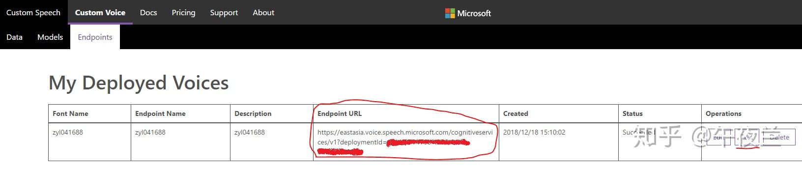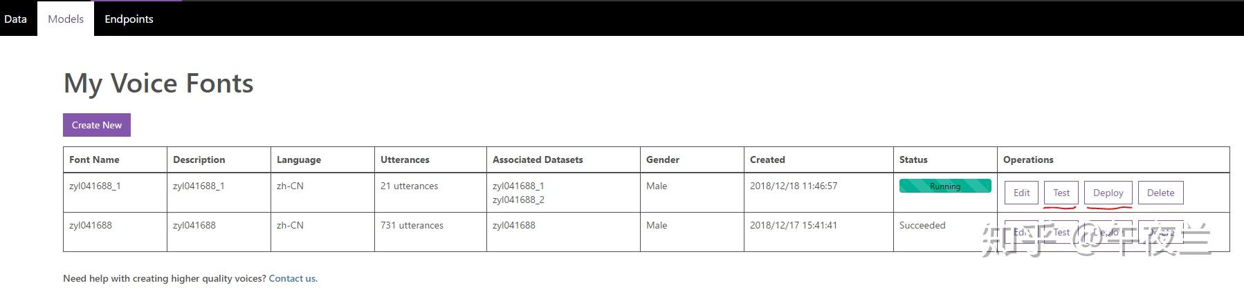如果想实时调用自己创建的个性化语音,比如智能语音设备的交互功能,或者是手机APP的交互功能,就需要将它部署到Azure云平台,并为其创建Endpoint。具体操作方法如下: