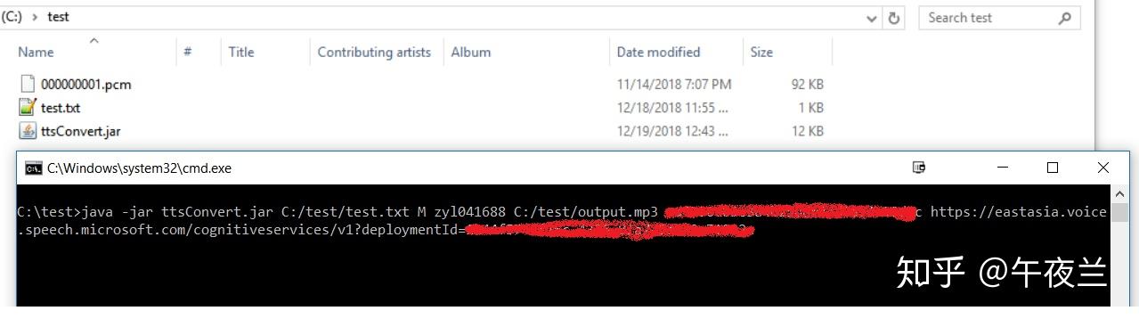 java -jar ttsConvert.jar C:/test/test.txt M zyl041688 C:/test/output.mp3 <Your Key> < Your Endpoint>