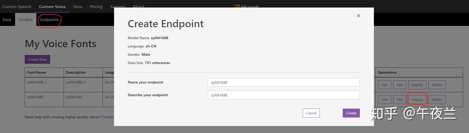 回到我的声音主界面,点击“Deploy”按钮,然后输入语音服务的名字和描述。点击“Create”按钮后页面会自动跳转到“Endpoint”页。