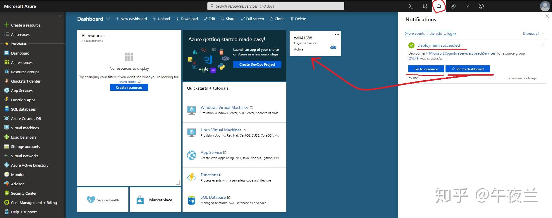 初始化好了之后,右上角的会提示部署完成,点击 "Pin to Dashboard"创建一个控制台快捷方式,点击 ”Go to resource“,可以进入资源页面