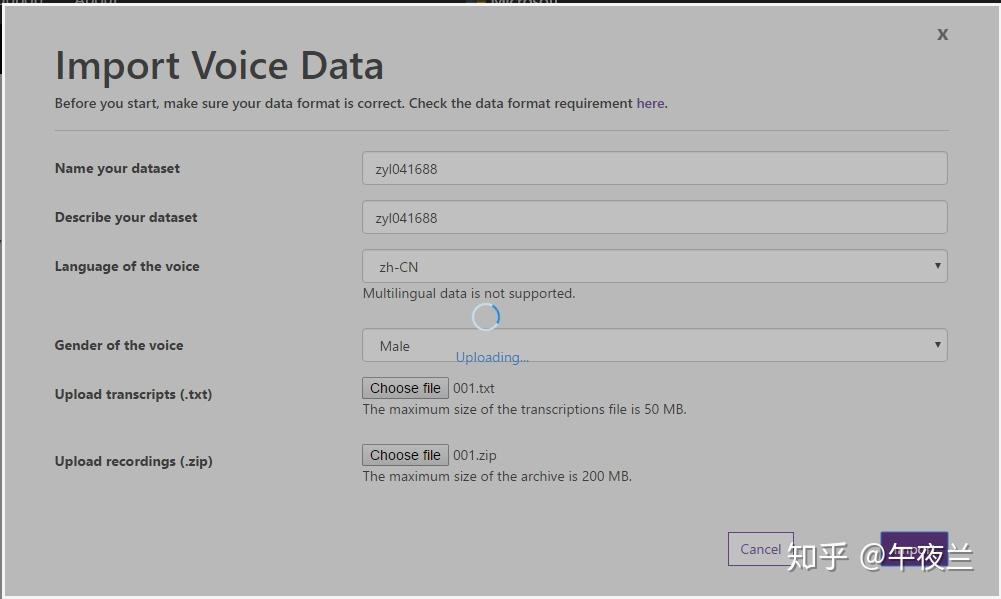 需要一点耐心,要传一阵子。在上传的过程中系统会自动检验文本文件和音频文件的格式,为了防止花很长时间上传大文件结果检验失败的情况发生,可以先传几个小文件试试,允许多次上传。
