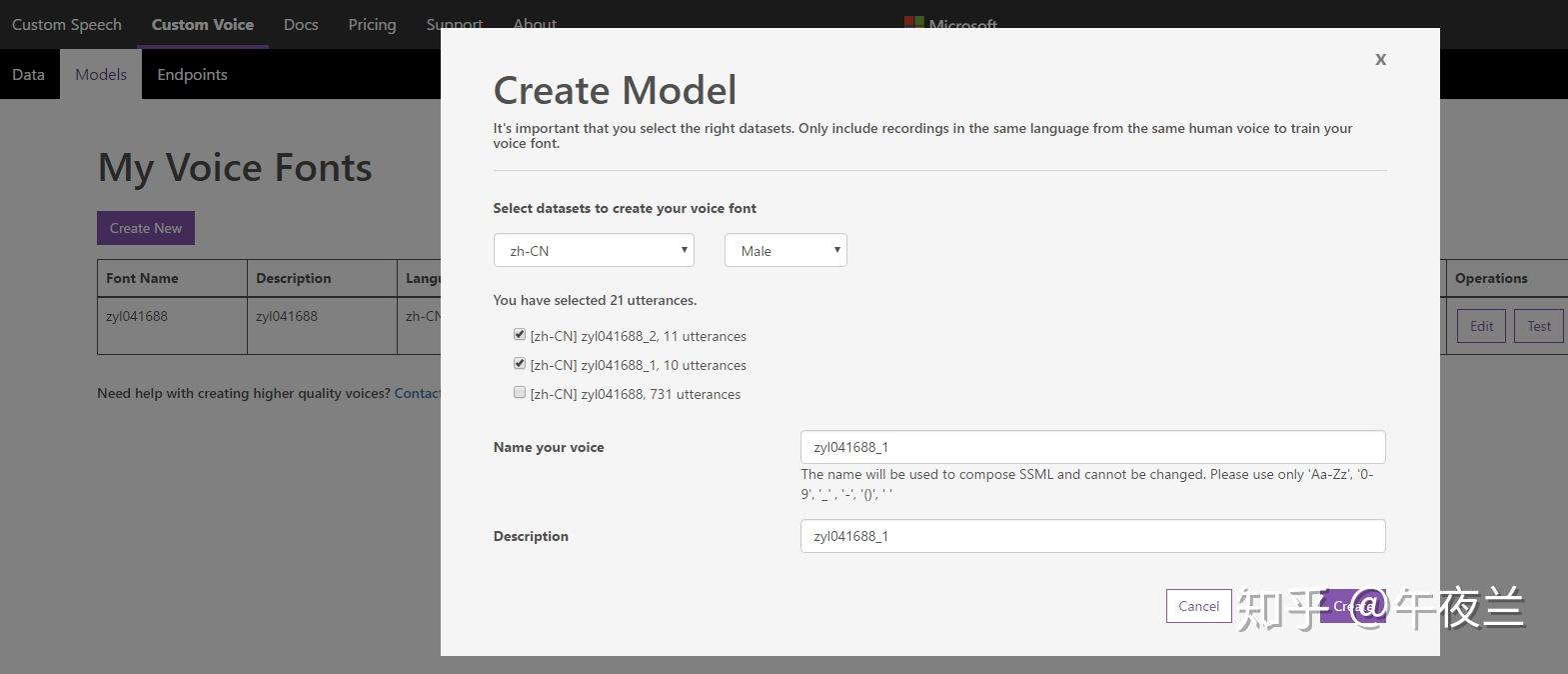 上传完成后,可以开始创建个性化的语音了: 创建语音