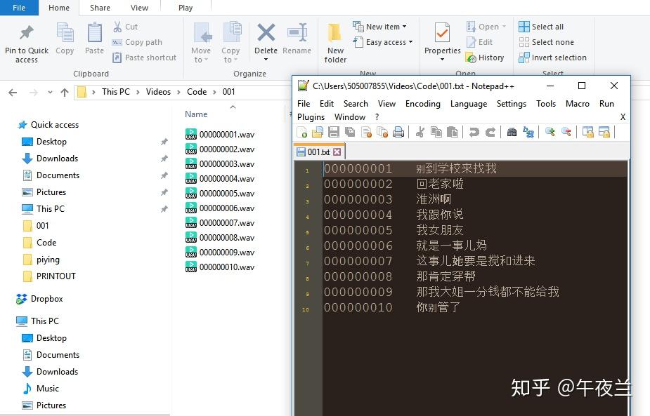 文本文件的内容为文件名编码和语音内容的组合,一行一句,二者需一一对应,文件名编码和内容之间用 tab 键分隔(注意,不是空格!不是空格!不是空格!我开始打的空格,七百多个文件好不容易传完,结果检验失败,哭死),其样式如下: