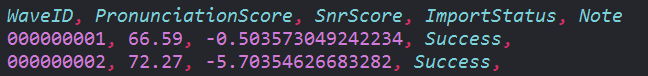 - SnrScore : 音频噪音程度,分数越高说明噪音越低,专业录音棚可以达到50+,低于20分最终结果中也会听到明显的噪音。