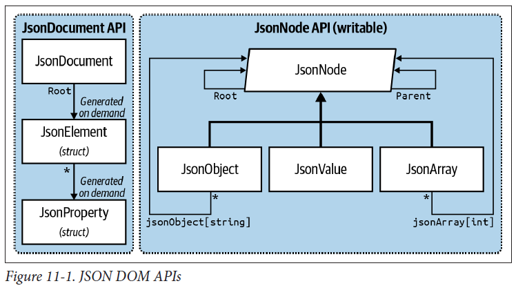 JsonNode(在 System.Text.Json.Nodes 中)是在 .NET 6 中引入的,主要是为了满足对可写 DOM 的需求。然而,它也适用于只读场景,并公开了一个更流畅的接口,由使用 JSON 值、数组和对象类的传统 DOM 支持(见图 11-1)。作为类,它们会产生垃圾收集成本,但这在大多数真实场景中可能可以忽略不计。 JsonNode 仍然是高度优化的,当重复读取相同的节点时实际上可以比 JsonDocument 更快(因为 JsonNode 虽然懒惰,但会缓存解析结果)。