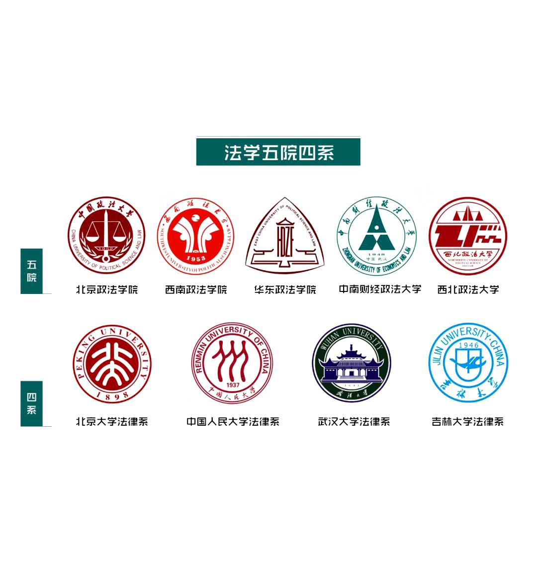 中国政法大学、西南政法大学、西北政法大学、中南财经政法大学、华东政法大学、北京大学法学院、中国人民大学法学院、吉林大学法学院、武汉大学法学院