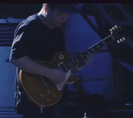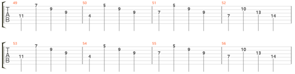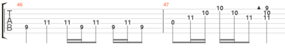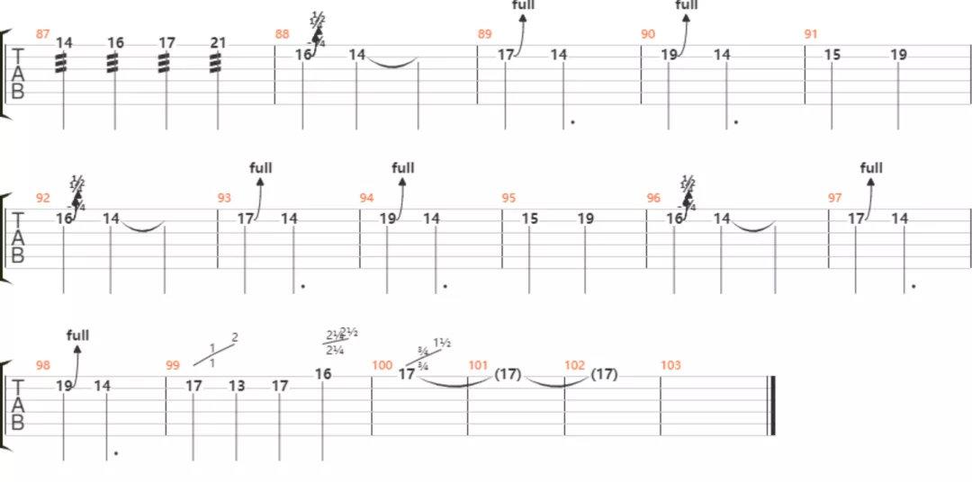 经过接下来的8小节,主音吉他则开始使用滑棒来回演奏5度的滑音,结尾处另一把吉他则是通过重复的滑音揉弦采取过渡,而滑棒吉他则一路滑到了琴桥部。