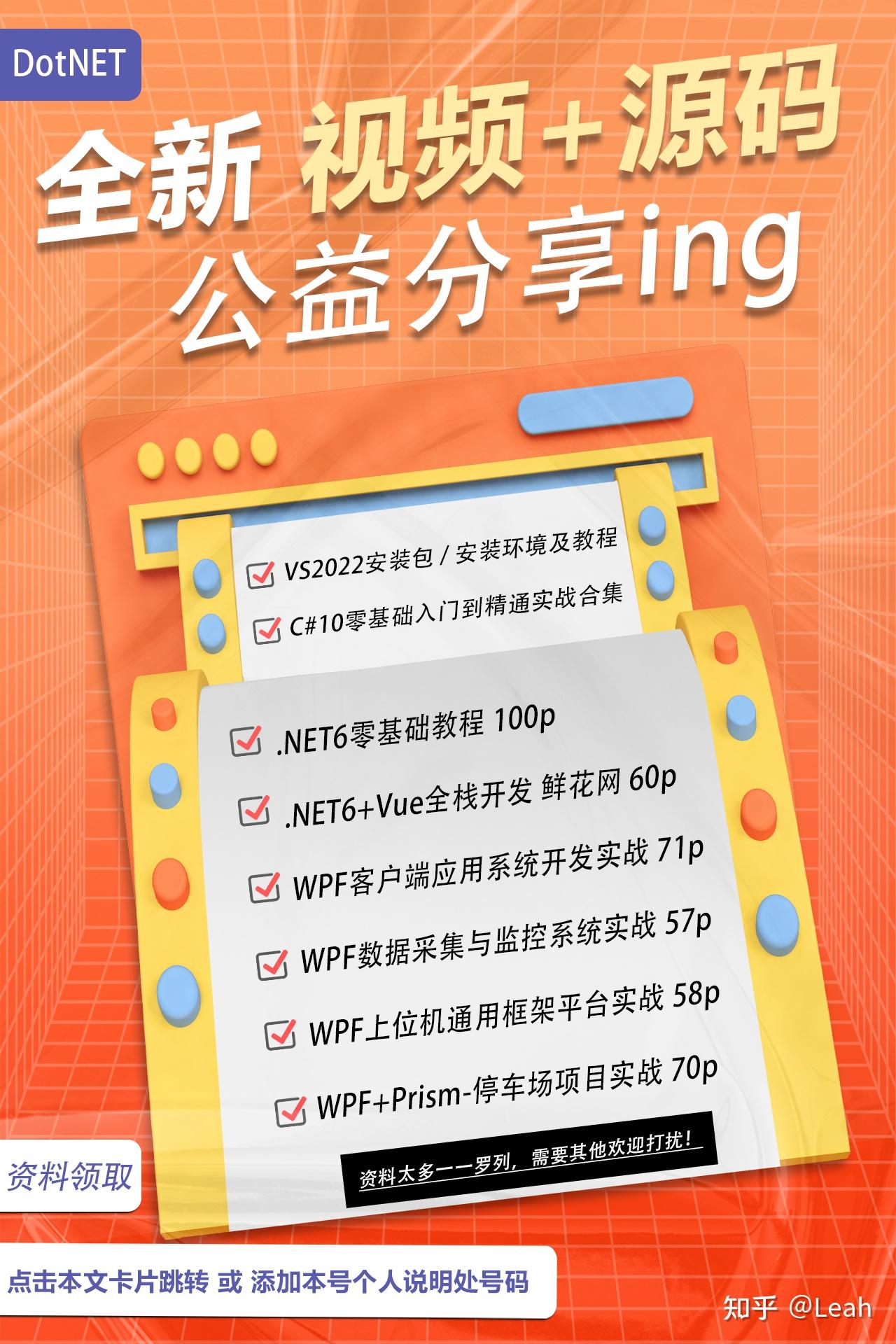 同时也给大家带来一份学习资料清单,涵盖.NET零基础、C#进阶、WPF上位机等学习资料。需要的小伙伴可点击图片下面的链接,直接跳转到群,可供需要学习的小伙伴自行下载。
