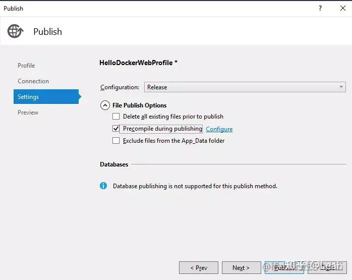 点击Next button,弹出如图Image-7所示的对话框,勾选Precompile during publishing,官方给的解释是:This optimization means that you'll be compiling views in the Docker container, you are copying the precompiled view.: