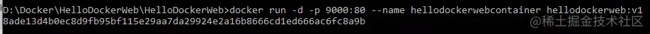 通过运行指令docker run -d -p 9000:80 --name hellodockerwebcontainer hellodockerweb:v1 来运行容器,结果如图Image-13所示,返回的是当前Container的ID,我们可以在地址C:\ProgramData\Docker\windowsfilter\ 中找到该容器