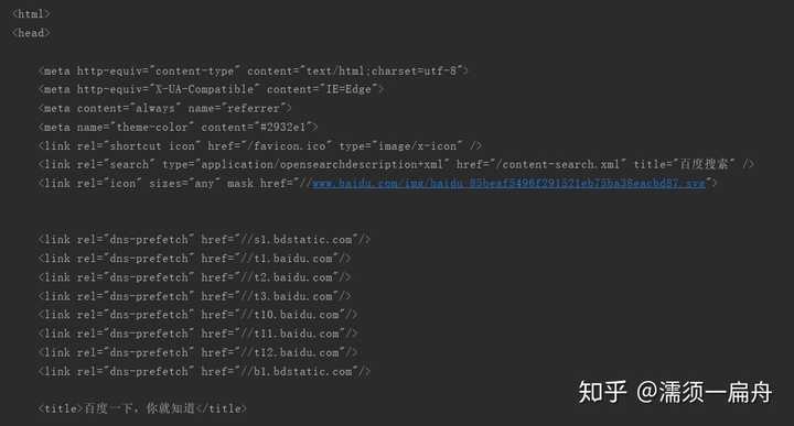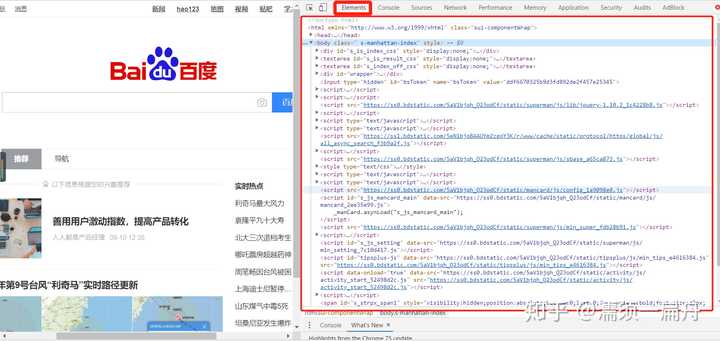 我们看一下真正百度首页html是什么样的,如果你用的是谷歌浏览器,在百度主页打开设置>更多工具>开发者工具,点击element,就可以看到了: